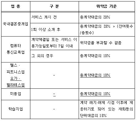 미용업은 ‘소비자분쟁해결기준’과 마찬가지로 서비스 개시여부 및 계약 해제·해지시기와 관계없이 위약금 한도액을 ‘총계약대금의 10%’로 했다.