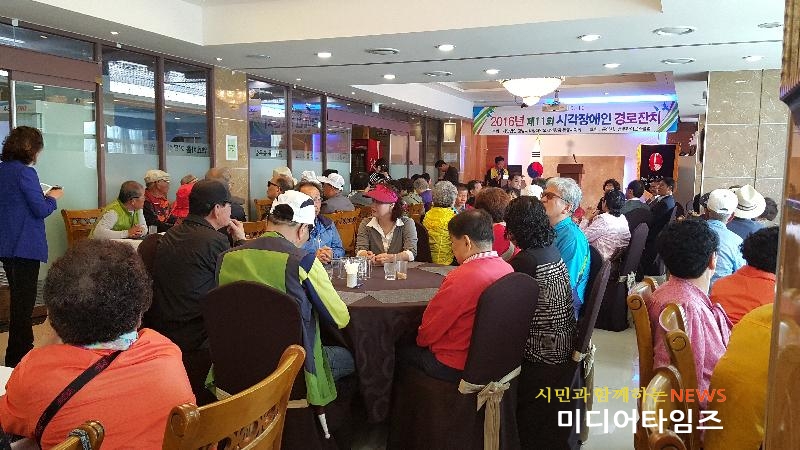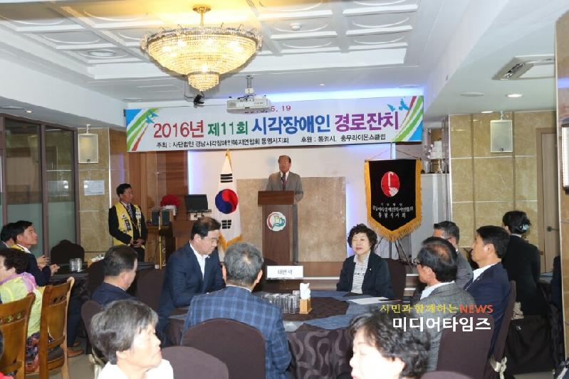 [미디어타임즈 = 최귀복 기자] 제11회 시각장애인 경로잔치가 지난 5월 19일, 엔쵸비관광호텔에서 통영시장(김동진), 도의회 의장(김윤근), 통영시의회 의장(강혜원), 통영시장애인종합복지관장, 충무라이온스 회장, 바르게살기운동협의회장, 장애인 가족, 자원봉사자 등 150여 명이 참석한 가운데 열렸다.