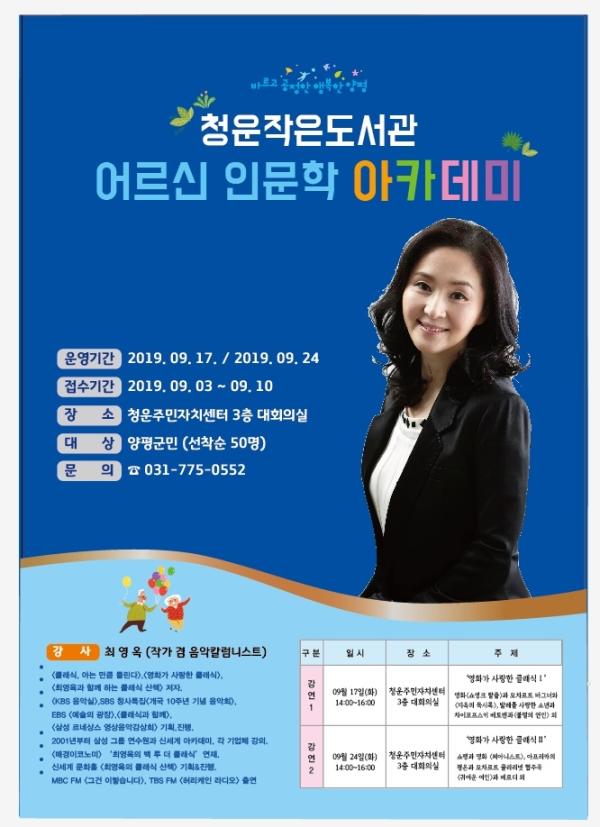 양평군 청운작은도서관이 ‘영화가 사랑한 클래식’이란 주제로 어르신 인문학 아카데미를 진행한다.