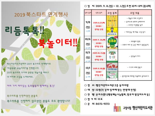 ‘리듬톡톡 북놀이터’ 강좌는 아이들의 오감발달을 위해 도서와 관련된 여러 가지 책놀이 활동을 해보는 독서프로그램으로 2019년에 북스타트를 신청했던 사람이라면 관련도서로 아이와 더 다양한 책놀이를 경험해보고 부모와 아이의 유대감을 형성 해보는 기회를 가질 수 있다. 또한 북스타트를 신청하지 않았더라도 함께 모여 책을 읽으며 도서와 관련된 여러 가지 활동을 함으로써 독서에 흥미를 느낄 수 있을 것이다.