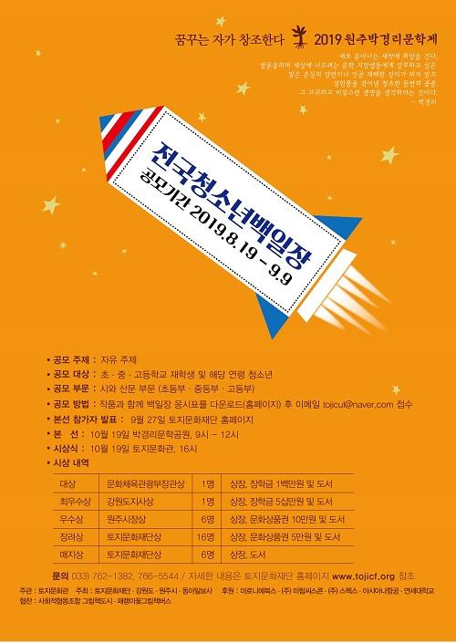 토지문화재단은 박경리 작가의 문학정신과 생명사상을 선양하고, 미래의 작가를 꿈꾸는 문학 청소년들을 격려하기 위해 ‘2019 원주박경리문학제 전국 청소년백일장 대회’를 개최한다.
