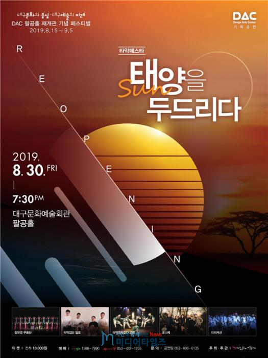 대구문화예술회관은 8월 30일 금요일 오후 7시 30분에 팔공홀 재개관을 기념하는 공연으로 ‘타악페스타’를 개최한다. 이번 공연은 새롭게 문을 연 대구예술의 미래를 두드리는 의미를 담아 ‘태양을 두드리다’라는 부재로 화려한 무대가 꾸며질 예정이다.