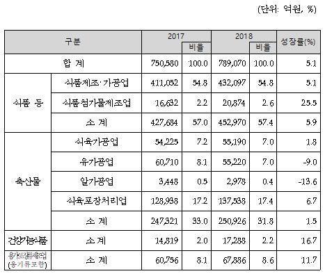 상위 생산품목인 식육제품과 관련한 식육포장처리업 생산실적은 2018년 13조7,538억원으로 전년 대비 6.7% 증가했고, 반면 저출산 영향에 따라 우유 및 유가공제품 생산실적 감소와 관련한 유가공업 생산실적은 2018년 5조5,220억원으로 전년 대비 9.0% 감소했다.
