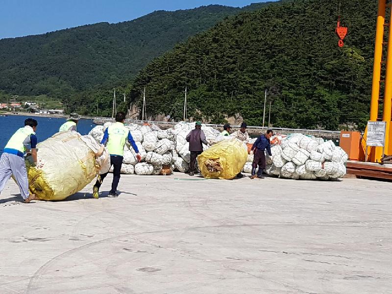 이 날 때이른 폭염 속에서도 아랑곳하지 않고, 조수에 의해 밀려온 폐스티로폼을 비롯한 해양 및 생활폐기물을 수거하여 해안변이 말끔하게 정돈됐다.