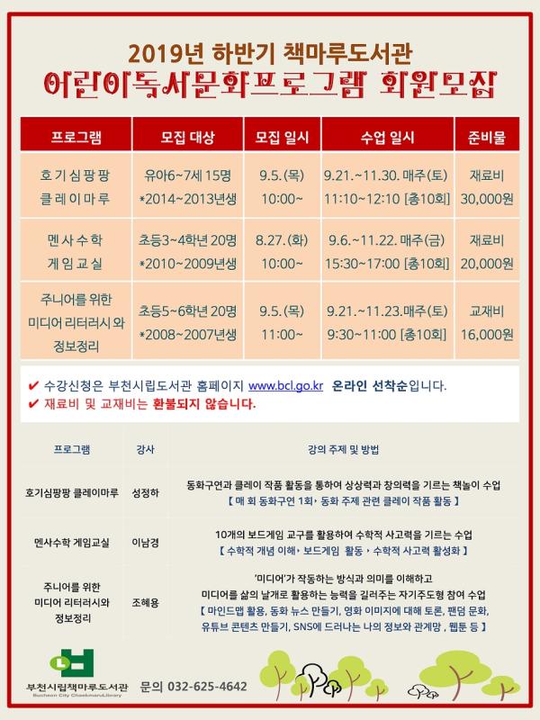 부천시 책마루도서관에서 2019년 하반기 어린이 독서문화프로그램 회원을 모집한다.