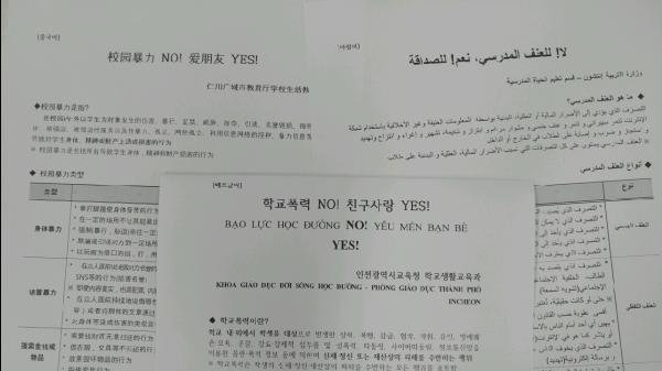 인천광역시교육청은 26일, 학교폭력의 개념 및 유형 등을 내용으로 한 다국어 리플릿을 제작하여 관내 학교 및 산하기관에 배포한다고 밝혔다.
