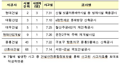 국토교통부는 시공능력평가 상위 100위 건설사 중에서 지난 7월 한 달 동안 사망사고가 발생한 회사의 명단을 공개했다.