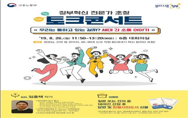 고용노동부는 26일에 ‘90년생이 온다’의 저자인 임홍택 작가를 초청해서 ‘공직사회 세대 간 소통’을 주제로 이야기를 나누는 시간을 가졌다.