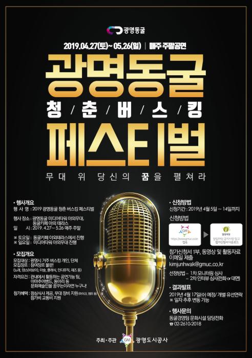 광명도시공사 김종석 사장은 “이번 행사는 관내의 문화예술인을 꿈꾸는 분들이 예술적 기량을 맘껏 발휘할 수 있는 기회”라며, “버스킹을 통해 광명동굴이 시민들이 문화를 공유하는 공간으로 거듭나고, 지역문화 성장 거점으로서 역할을 충실하게 수행할 수 있기를 기대한다”고 밝혔다.