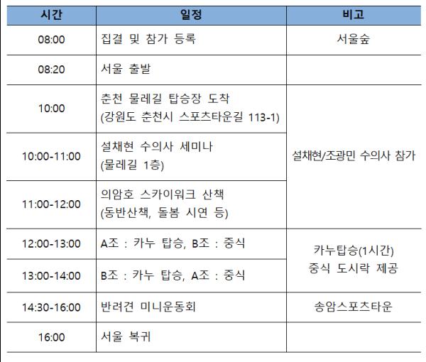 다음으로 춘천 관광명소인 의암호 주변을 둘러볼 수 있는 의암호 스카이워크를 반려견과 함께 산책하며 자연과 동물과 사람이 함께 의암호의 풍광을 만끽하는 시간이 준비되어 있다. 또한 산책이 끝나고 나서는 이번 이벤트의 일정 중 가장 관심과 기대가 높은 반려견과 함께 타는 물레길 카누투어 체험도 준비되어 있다. 사람과 반려견이 함께 카누를 타고 의암호 물 위를 누비는 모습은 평생 간직하고픈 추억으로 남을 것이다.