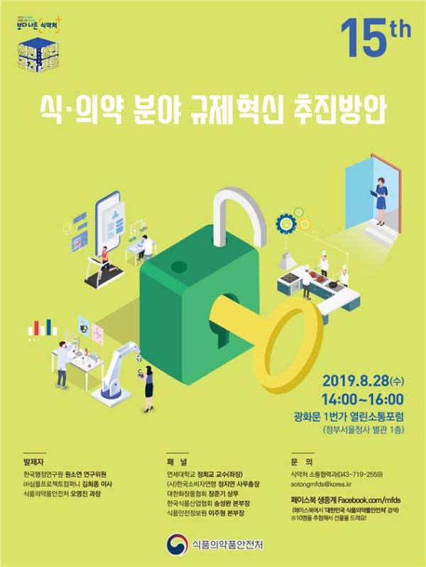 식품의약품안전처는 오는 28일 소비자단체·업계·학계와 함께 ‘식·의약 분야 규제혁신 추진방안’을 주제로 ‘제15회 식품·의약품 안전 열린포럼’을 광화문1번가 열린소통포럼실에서 개최한다고 밝혔다.
