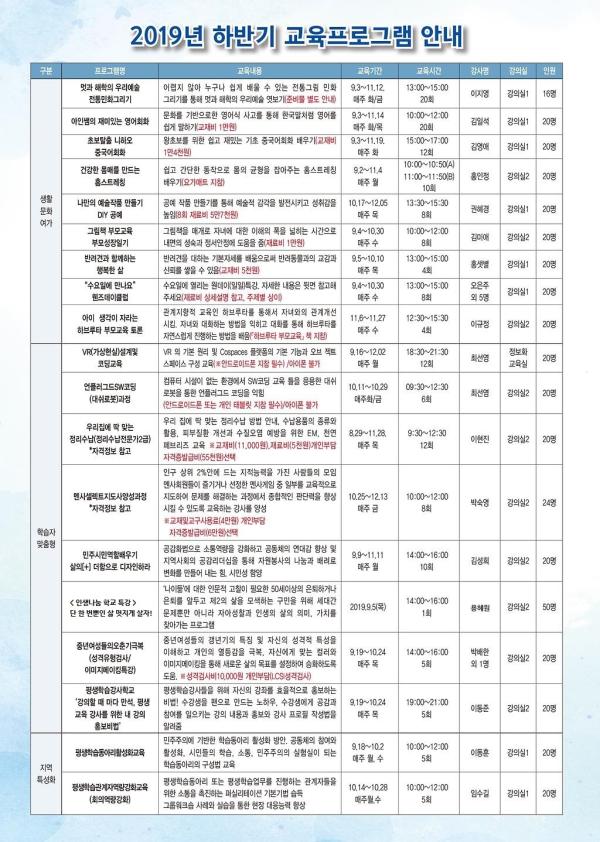 또한, 공동체 참여를 위한 학습동아리 구성법을 배우는 평생학습 동아리 활성화 교육과 평생학습 관계자들이 회의역량을 기를 수 있도록 퍼실리테이션 기본기법을 익히는 지역특성화 교육도 진행된다.