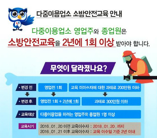 기존의 다중이용업소의 안전관리에 관한 특별법은 영업 개시 전 최초 1회만 소방안전교육을 이수하면 됐으나, 2016년 1월부터 신설된 ‘보수교육’에 따라 영업주와 종업원 1명 이상은 영업 개시 전 교육뿐만이 아니라 2년에 1회 이상 추가로 보수교육을 받아야 하고 위반 시에는 300만원 이하의 과태료를 처분 받게 된다.