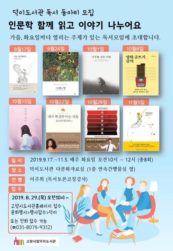 고양시 덕이도서관은 독서의 계절 가을을 맞이해 오는 9월 17일부터 11월 5일까지 매주 화요일 오전에 인문학 독서모임을 개최한다.
