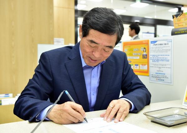 윤화섭 안산시장이 27일 NH농협 안산시지부를 방문해 ‘극일 펀드’로 알려진 ‘NH-Amundi 필승코리아 주식형’ 펀드에 가입했다.
