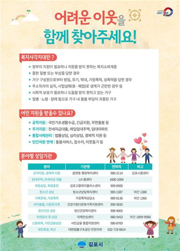 지난 6월 읍면동 맞춤형복지팀과 간담회를 개최하고 의견수렴을 통해 김포시 전체 세대에 대한 홍보 및 지원계획을 수립했다. 복지사각지대 시스템으로 파악되지 않는 민간아파트와 자연마을에는 ‘어려운 이웃을 찾아주세요’ 홍보문을 우편발송하고 통·리장, 지역사회보장협의체, 사회복지명예공무원을 통해 직접 배부했다.