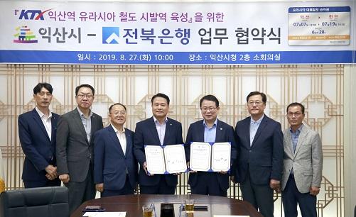 익산시는 27일 익산시청 소회의실에서 전북은행과 KTX 익산역 유라시아 거점역 선정을 염원하기 위해 공동 노력의 필요성에 공감하고 ‘유라시아 철도 정기적금’ 상품 출시 등 지속적인 관련 사업 추진을 위한 업무협약을 체결했다.
