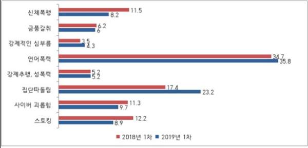 언어폭력, 집단따돌림, 사이버괴롭힘, 스토킹 순으로 많아