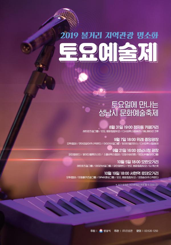 이후 9월 21일 여수동 성남시청 광장, 10월 5일 성남동 모란오거리, 10월 19일 서현역 로데오거리에서 각각 토요 문화예술 축제가 열린다.