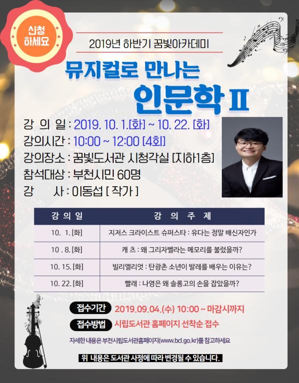 부천시립꿈빛도서관은 오는 10월 1일부터 22일까지 ‘2019 꿈빛아카데미: 뮤지컬로 만나는 인문학 Ⅱ’강좌를 운영한다.