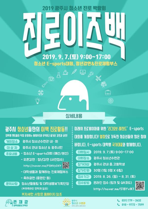 광주시 청소년수련관은 청소년들의 다양한 진로체험을 위해 오는 9월 7일 청소년 이색 진로박람회 ‘진로 이즈 백’을 수련관 로비 및 앞마당에서 개최한다.