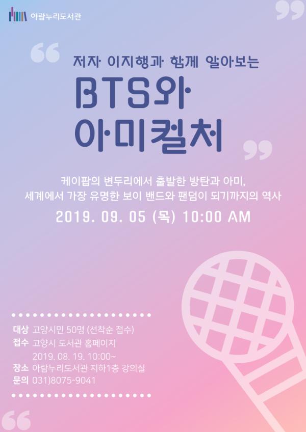 예술 특성화 도서관인 고양시립 아람누리도서관은 오는 9월 5일 오전 10시부터 문화체육관광부가 주최하고, 한국도서관협회가 주관하는 예술특화프로그램 ‘BTS와 아미컬처’에 대한 강연을 개최한다.