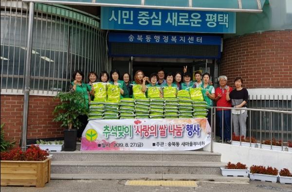 송북동 새마을부녀회 회원들은 평소 바쁜 일상생활에도 불구하고 사랑의 바자회, 헌옷 수거 등 다양한 행사를 실시하여 기금을 마련했으며, 소외되고 어려운 이웃을 돌보기 위한 다양한 봉사활동을 펼쳐 오던 중 이번 추석명절을 맞이하여 사랑의 쌀 1,000kg을 송북동에 전달했다.