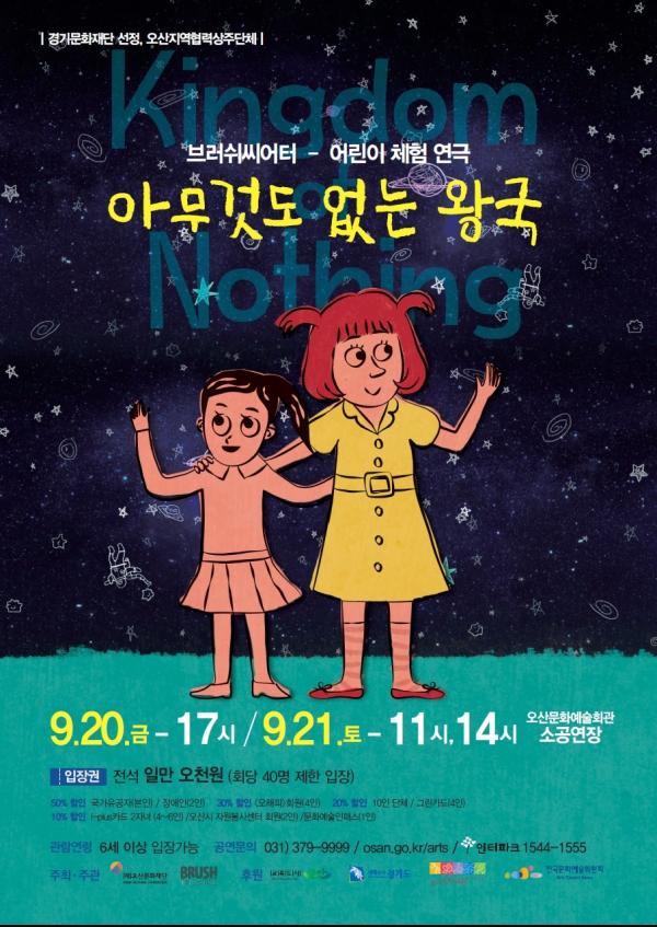 테크닉 훈련과 오산문화재단의 쇼케이스를 통해 완성된 브러쉬씨어터의 어린이 실험연극 ‘아무것도 없는 왕국’은 아동 청소년 관객의 오감을 자극하는 새로운 연극체험을 선사하는 것을 목표로 한다. 관객이 무대 위에 오르는 연극 특성상 1회당 40명의 한정된 인원으로 운영되며 아동뿐만 아니라 가족 모두의 관람을 권장한다. 오산문화예술회관 소공연장에서 총 3회 공연이 예정되어 있으며, 8월 중 티켓 오픈을 앞두고 있다.