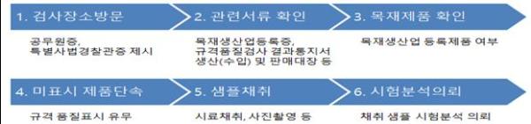 품질관리 단속반은 목재생산업 등록증, 규격·품질검사 결과 통지서 등 관련 서류를 확인하고, ‘목재의 지속가능한 이용에 관한 법률’에 따라 ‘목재제품 규격·품질표시 기준’으로 고시된 품목별 규격표시 방법, 품질기준·등급에 적합 여부를 단속한다.