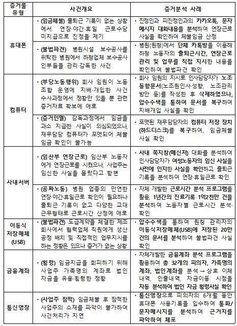 이번에 발간한 사례집은 휴대폰·컴퓨터 등 증거자료별, 장시간 근로·임금체불·불법파견 등 주요 사건 분야별로 각 증거분석 기법 및 주요 활용사례를 제시하고 있어 일선 현장의 근로감독관에게 활용도가 높다는 평이다.