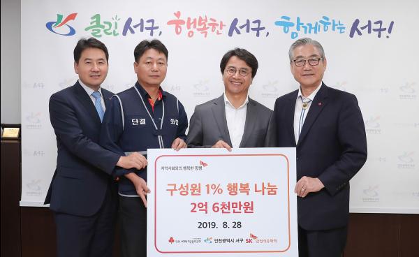 인천 서구는 28일, SK인천석유화학으로부터 사회공헌 사업비 2억6천만 원을 전달 받았다. 이번에 전달된 기금은 인천사회복지공동모금회를 통해 지역의 어려운 이웃을 위해 사용될 예정이다.