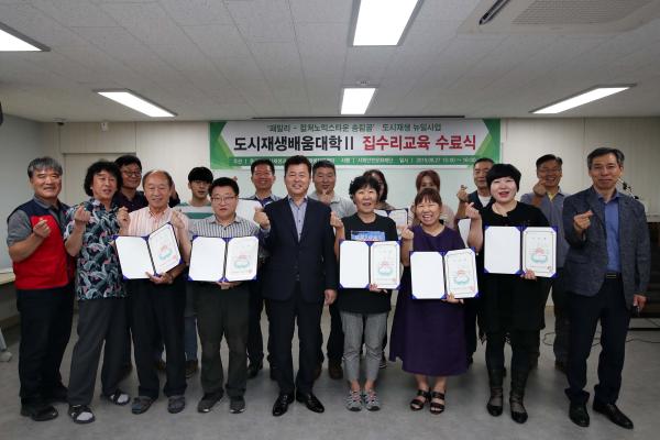 도시재생배움대학 2기 집수리교육은 지난 7월 2일부터 8월 27일까지 총 15회에 걸쳐 실생활과 밀접한 도배, 전기, 목재가구 제작 등 이론 및 실습과정으로 진행됐으며, 도새재생에 대한 수강생들의 뜨거운 열의와 관심으로 등록 수강생 25명 중 14명이 이번 도시재생배움대학 2기 집수리교육 과정을 수료했다.
