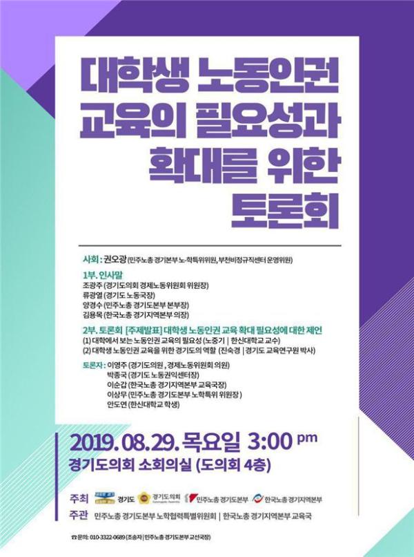 경기도가 경기도의회, 민주노총 경기도본부, 한국노총 경기지역본부와 함께 29일 오후 3시 경기도의회 소회의실에서 ‘경기도 대학생 노동인권 교육의 필요성과 확대를 위한 토론회’를 개최한다.