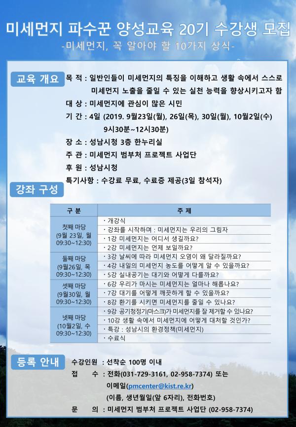 이번 교육은 일반인들이 미세먼지의 특징을 이해해 생활 속 대응력을 높이게 하려고 미세먼지 범부처 프로젝트 사업단이 주관하고 성남시가 후원해 마련된다.