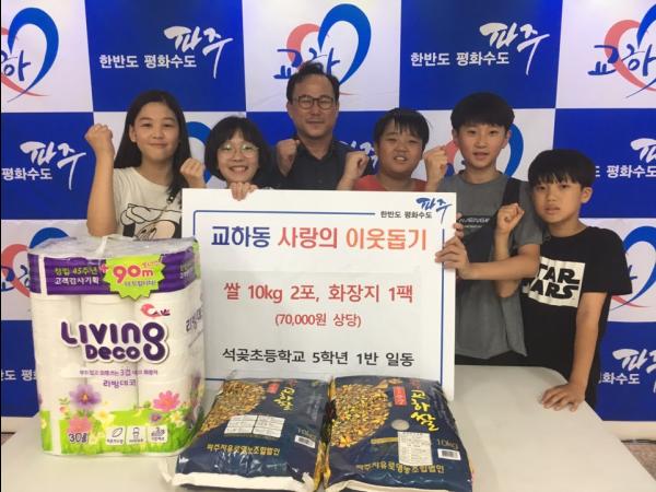 지난 27일 석곶초등학교 학생들의 올해 세 번째 교하동 행정복지센터 방문이 있었다. 이날 석곶초등학교 5학년 1반 학생들은 어려운 이웃을 위한 10kg 쌀 2포, 두루마리 화장지 1팩을 직접 전달했다.