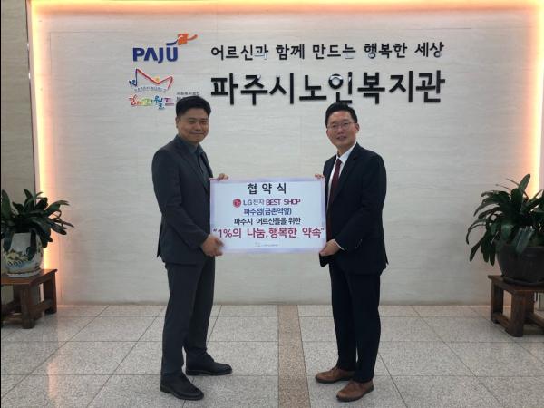 파주시 노인복지관과 파주시 금촌동에 위치한 LG전자 베스트샵 파주점은 지난 28일 어르신을 위한 ‘1%의 나눔, 행복한 약속’ 협약을 진행했다.
