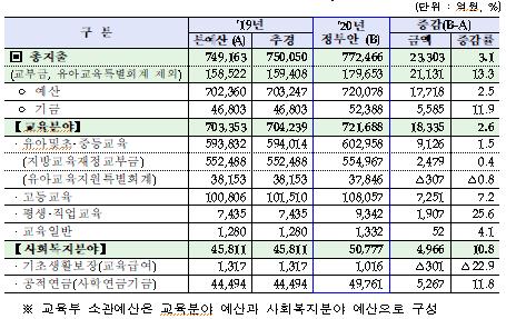 2020년 교육부 예산안의 주요 특징은 다음과 같다.