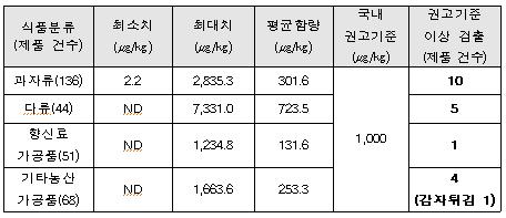 국내 저감화 권고기준치를 초과한 제품은 총 20건으로 과자류 10건 다류 5건 향신료 가공품 1건 기타 농산가공품 4건 등이다.