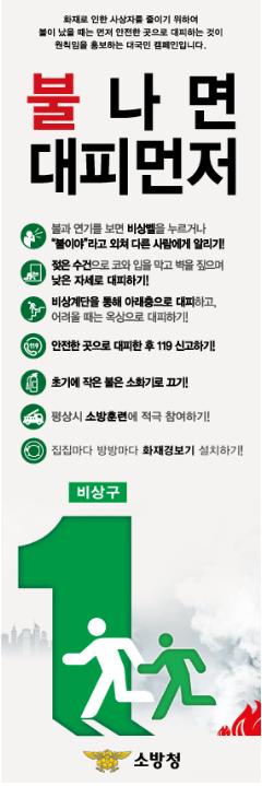 이에 소방서는 홍보포스터를 관내 학교, 관공서, 다중이용시설 등에 부착하고 리플릿은 안전교육 자료로 활용하고, X배너는 소방서에 설치해‘불나면 대피먼저’를 적극 홍보 할 방침이다