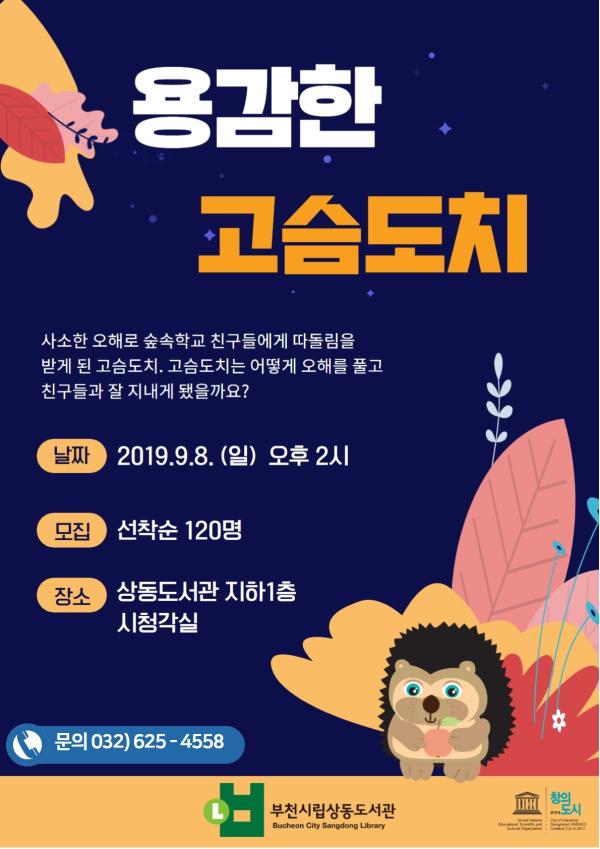 부천 상동도서관에서 오는 9월 8일 꼬마 인형극 ‘용감한 고슴도치’를 공연한다.