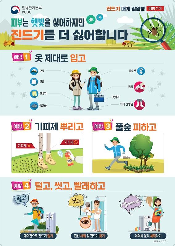 또한, 야외활동이나 작업 후에는 샤워를 하면서 진드기에 물린 곳이 있는지 확인하고, 활동복과 작업복은 따로 세탁해야 한다.