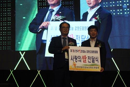 한국쌀전업농 강원도 연합회는 지난 27일 원주에서 열린 ‘제7회 한국쌀전업농 강원도 회원대회’ 개막식에서 어려운 이웃을 돕기 위한 사랑의 쌀 전달식을 가졌다.