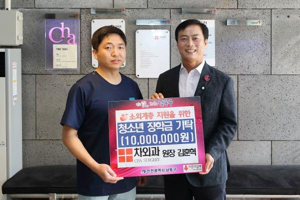 인천 남동구는 지난 27일 구월동 소재 차외과로부터 저소득층 청소년 지원을 위한 희망 장학금 1천만원을 기탁 받았다.