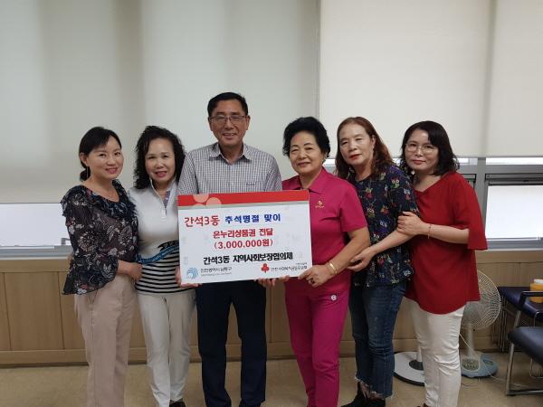 [14-20190829144219.jpg] 인천 남동구 간석3동 지역사회보장협의체가 추석 명절을 맞아 지역 내 어려운 이웃을 위해 300만원 상당의 온누리상품권을 후원했다.