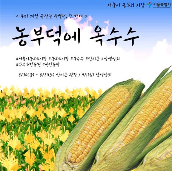 서울시는 오는 30일부터 10월26일까지 만리동광장, 어린이대공원, 상생상회, 마포구 DMC 등 4개소에서 지역 우수농수특산물과 문화축제가 어우러지는 ‘농부의 시장’을 연다고 밝혔다. 하반기 첫 개장은 오는 30일 만리동 광장이며, 운영 시간은 오전 10시부터 오후 6시까지이다.