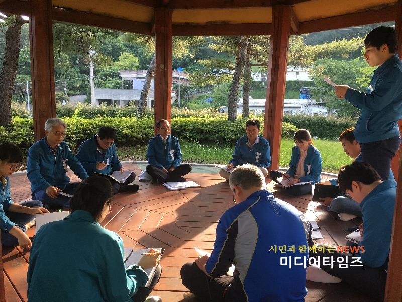 | 지난 23일, 오망천 소공원에서 직원 친절 시 낭송 및 동부면 자체 친절 ‘3-S’(Stand-up, Smile, Say-yes) 구호를 외치고 있다. |