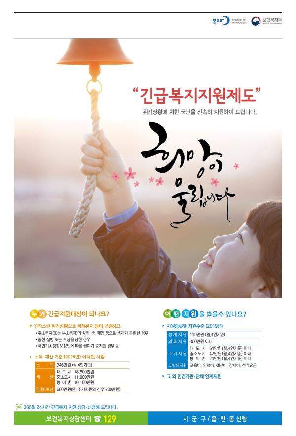 시 관계자는 “긴급복지지원제도에 대해 적극적인 홍보를 통해 어려움에 직면해 있는 주민들이 위기상황을 해소할 수 있도록 최선의 노력을 다하겠다.”고 말했다.