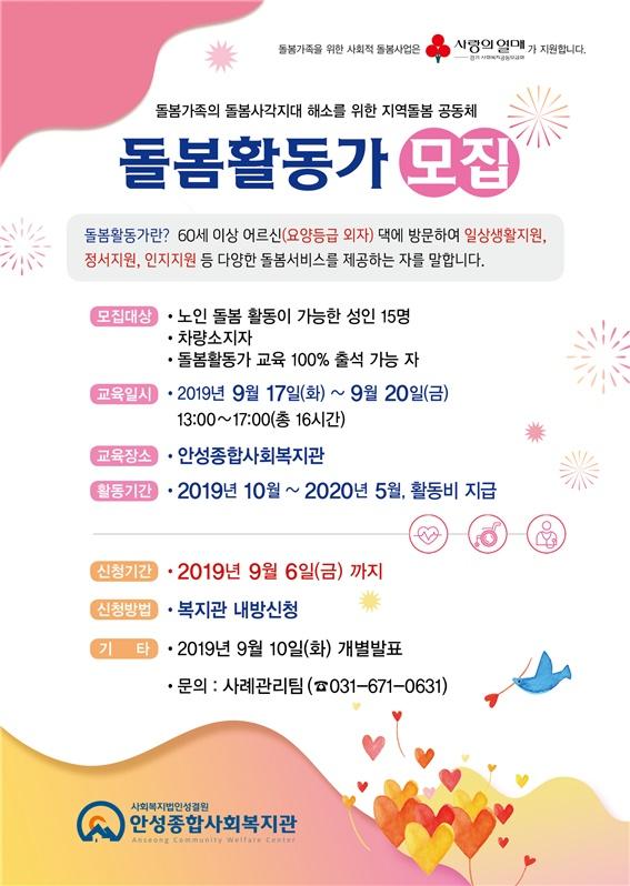 안성시 안성종합사회복지관에서 ‘우리동네 함께돌봄’ 사업에 참여할 돌봄활동가 15명을 모집한다.
