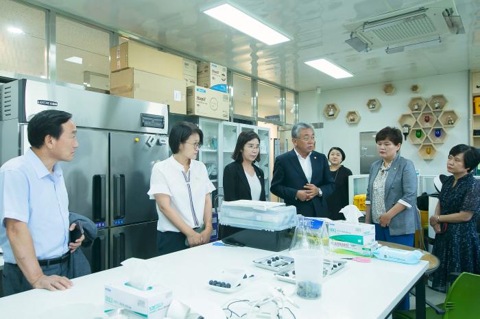 | 경제환경위원회 위원들이 농업기술센터 관계자로부터 품질관리에 대한 설명을 청취하고 의견을 나누고 있다. |