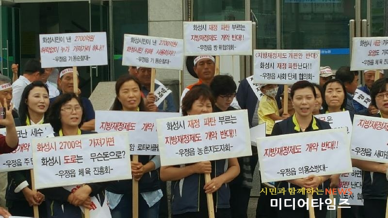 김국진 우정읍사회단체협의회장은 “정부의 개편안이 시행되면 화성시는 연간 2,700억의 예산을 빼앗겨 그로 인한 피해는 고스란히 시민들의 몫이 될 것이며, 특히 농촌인 우리 우정과 장안 지역은 농축산 지원사업 축소와 도로·교통 등의 사회인프라시설 투자 중단 등 피해가 심각할 것으로 우려된다”며, “정부는 지방자치에 역행하는 지방재정 개편안을 즉각 철회하고 국세와 지방세의 비율을 조정하는 등의 근본적인 대책을 마련하라”고 촉구했다.